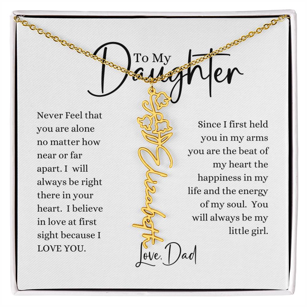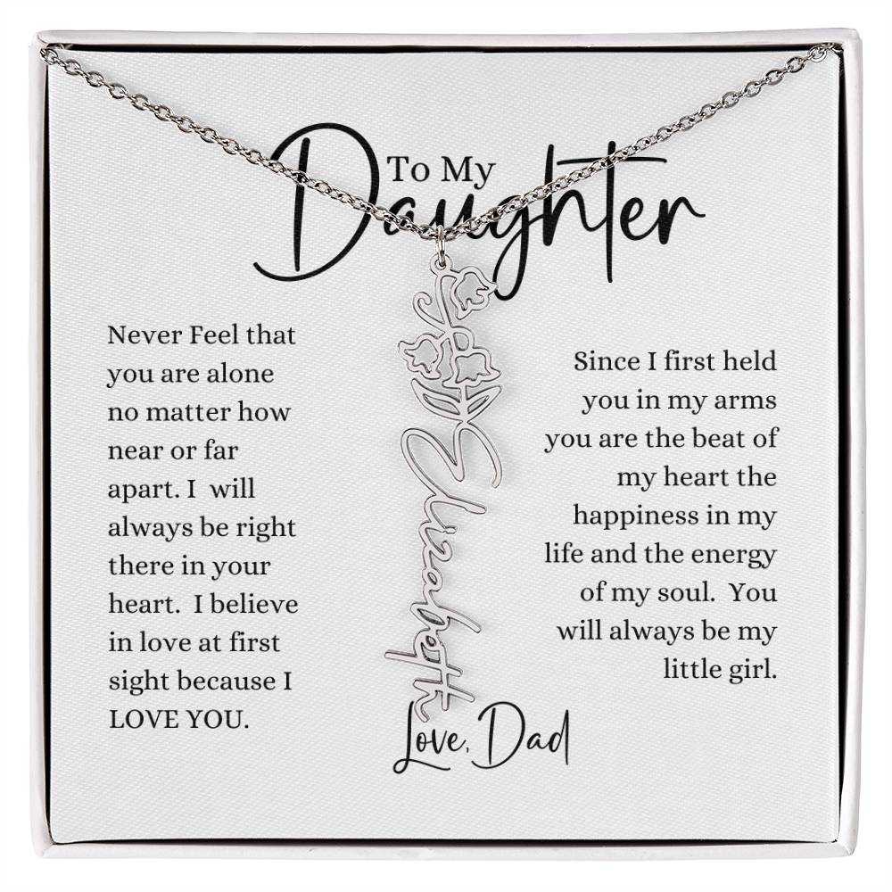 Never feel that you are alone no matter how near or far apart. I will always be right there in your heart. I believe in love at first sight because I Love you. Since I first held you in my arms you are the beat of my heart, the happieness in my life and the energy of my soul. You will always be my little girl. Love, Dad