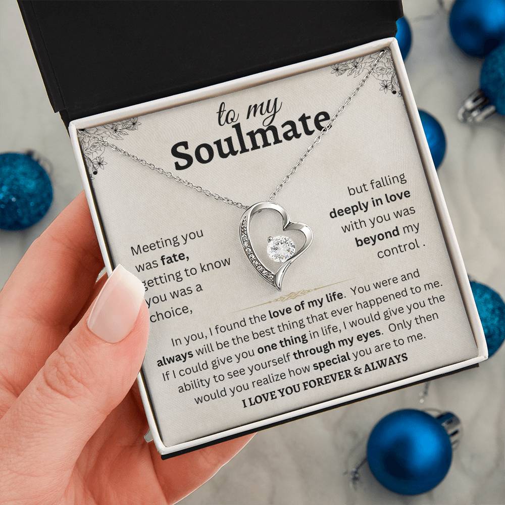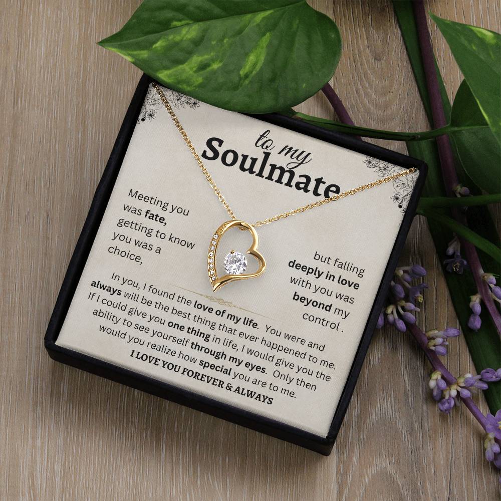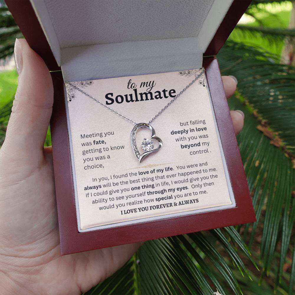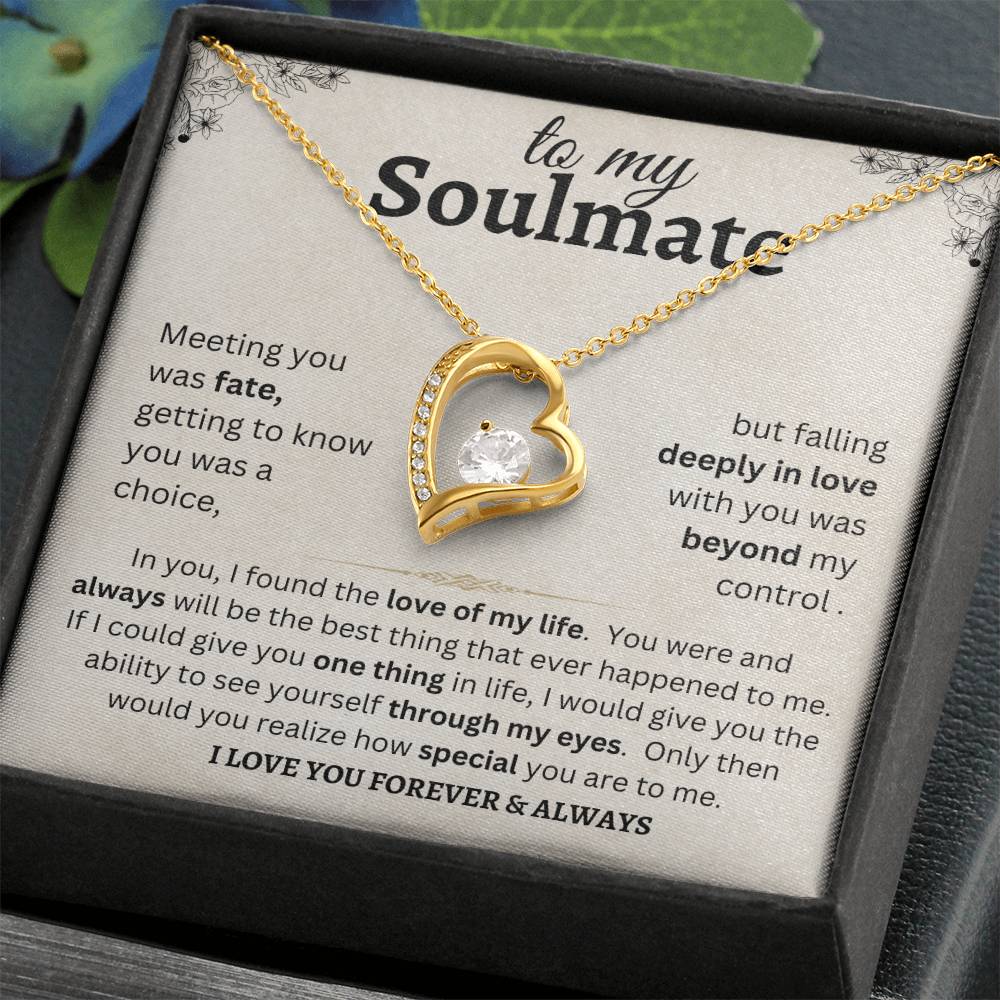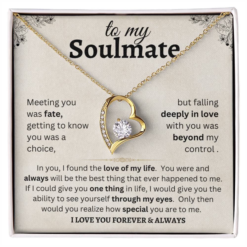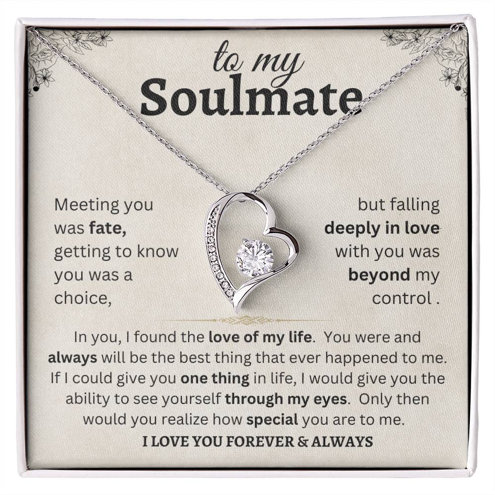 To my Soulmate meeting you was fate, getting to know you was a choice, but falling deeply in love with you was beyond my control. In you, I found the love of my life. You were and always will be the best thing that ever happened to me. If I could give you one thing in life, I would give you the ability to see yourself through my eyes. Only then would you realize how special you are to me. I love you forever & always